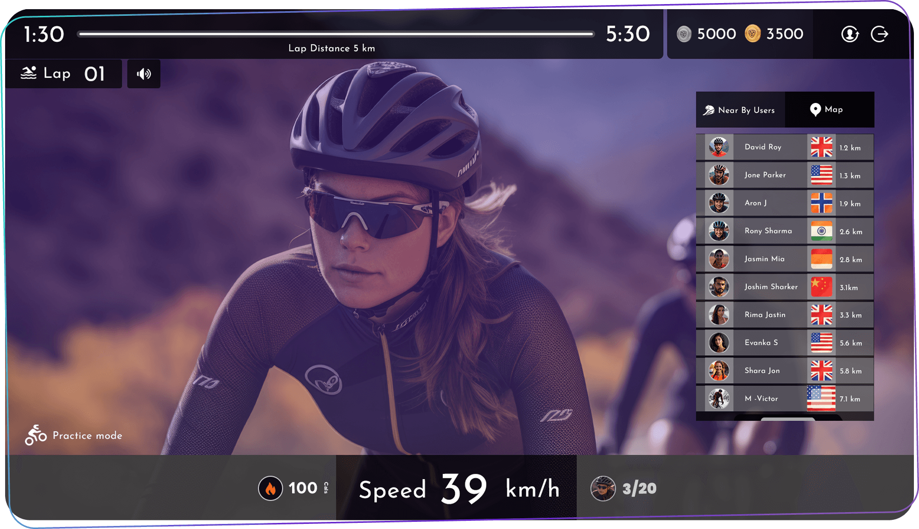 Unlike traditional spin bikes, Racing Gym is a fully gamified experience, allowing users to: